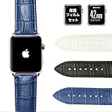 【AZUCK】 新型 アップルウォッチ クロコ型 本革 バンド (Series 4/3/2/1 対応 ベルト)保護フィルム付 『42mm, ブルー』